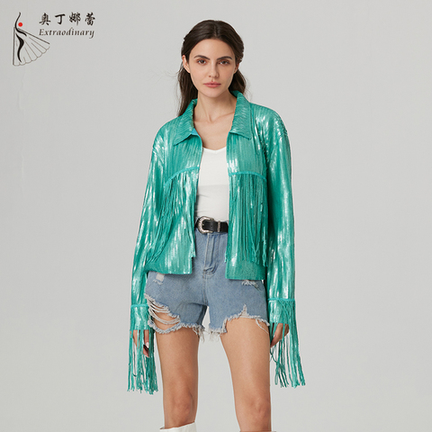 ファッションミントグリーンフリンジジャケットクールガール西洋カウボーイマットスパンコールジャケット