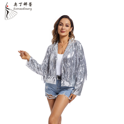 女性用ロングスリーブタッセルヒップホップジャズダンスコスチュームコートスパンコールボンバージャケット